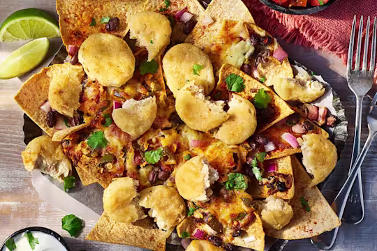 - Once the nuggets and nachos are cooked, cut the nuggets into halves and serve on top of the nachos with the pico de gallo and a dollop of sour cream.