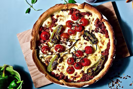- Top with grated cheese, cocktail tomatoes, jalapeños, salt and pepper and bake for around 20 minutes until the pastry is golden brown and the cheese melted and bubbly.