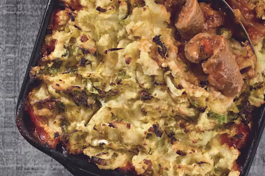 Give your sausage and mash supper a makeover! Sliced Quorn Sausages served in an onion gravy, topped with a shredded cabbage & leek colcannon mash. Perfect for a comforting family meal.