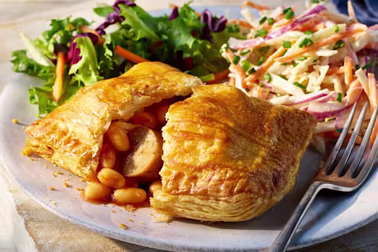 Golden puff pastry filled with all your faves – Quorn Sausage, baked beans and melty cheese, all cooked in the Air Fryer! Served with a crunchy coleslaw and a bit of green salad making this sausage and bean melt a delicious meal for lunch or dinner.