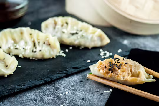 - Keeping the rest of the gyoza wrappers covered with plastic wrap, lay one on a clean work surface. Add about 7 1/2 tbsp of filling to the middle of the wrapper. Moisten the edge furthest away from you, fold over and seal. Start at the centre and work outwards to each side in turn, making little pleats in the layer facing you as you seal.