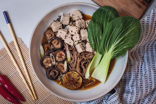 - Split noodles between four bowls, top with the pak choi, Quorn Pieces, and mushrooms and fill with the remaining broth