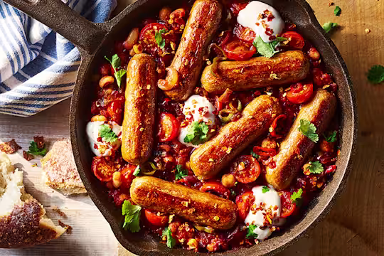 - Heat a drizzle of oil in a deep frying pan over a medium heat. Fry the Quorn Vegetarian Sausages along with the onion, garlic and chillies until soft and caramelised.